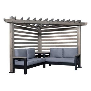 Design, privacy, shade, quality, and versatility. The Catalina cabana pergola with conversation seating is backyard discoverys unique, all-in-one backyard structure created with your needs in mind. Turn the heads of guests at your next outdoor party with a new, versatile take on relaxing and entertaining. The open concept design offers flexible applications for all settings making this the perfect choice for large or small yards, pools, fire pits, compact spaces, and corners or even a central focal point to a current outdoor space. The aesthetic appeal of our new cabana pergola sets the tone with rich, Barnwood stained cedar. Guests and family will have plenty of room to lounge on the black, powder-coated steel furniture frame, completely built-in for added strength and stability while Sunbrella fabric cushions add a perfect touch of modern quality and long-lasting comfort. The built-in patio table and armrests feature exotic meranti wood. Commonly chosen for its strength and durability in boatbuilding, meranti offers unique beauty and design that is proven to stand the test of time. Make backyard discoverys Catalina cabana pergola your choice in outdoor entertainment and give new life to your outdoor space with a one-stop solution to all of your outdoor furniture needs.