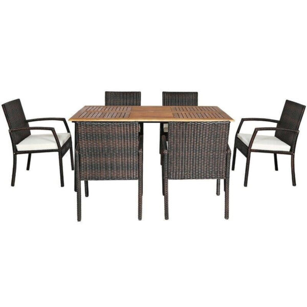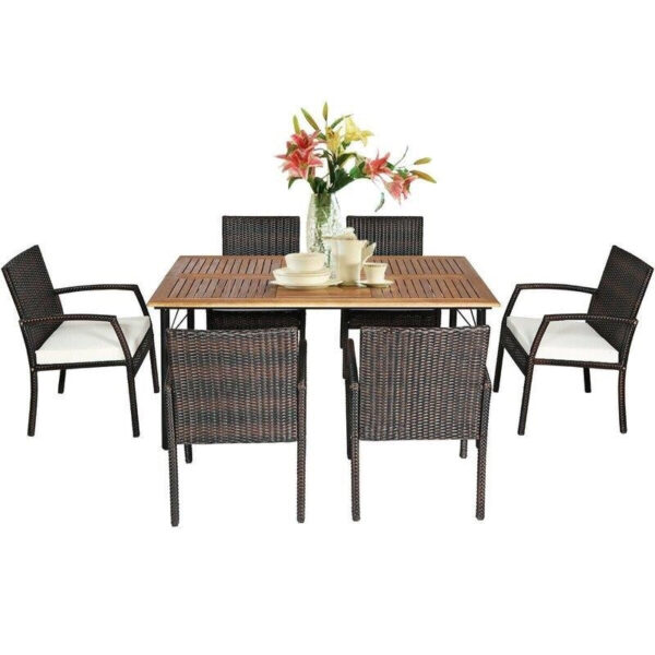 - In a classical and stylish appearance, this dining set can match any outside style and is a great supplement to outdoor space. You can invite your family or friends to enjoy a relaxing meal with these 7 pieces of patio dining set in your backyard, balcony, garden, etc.
