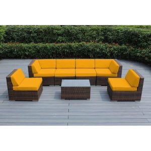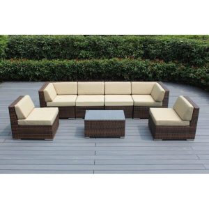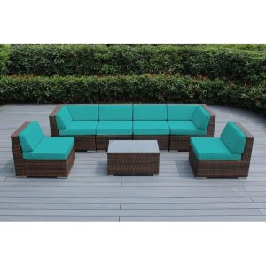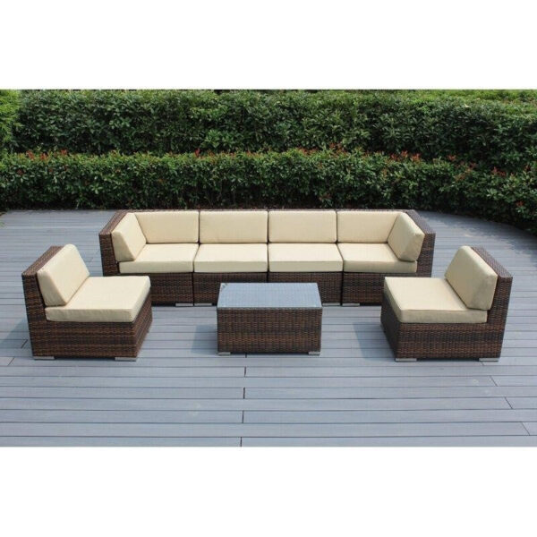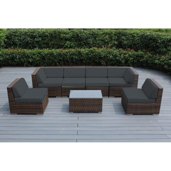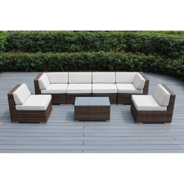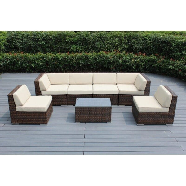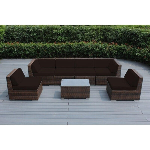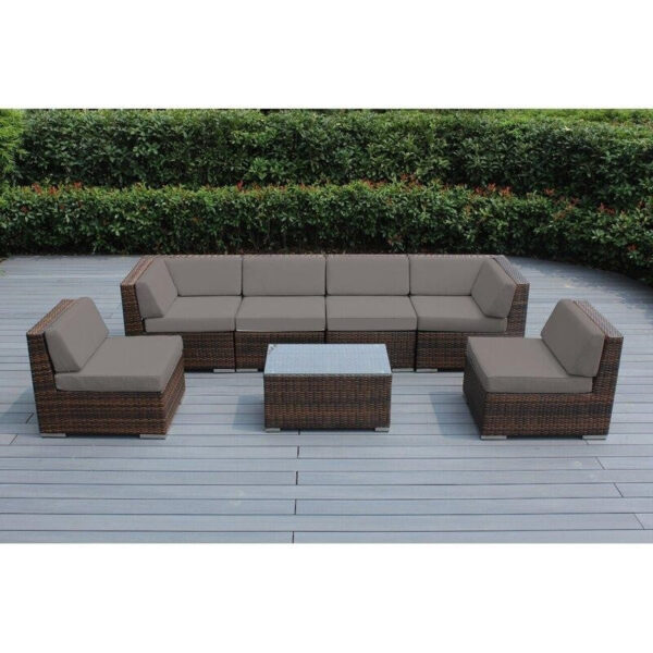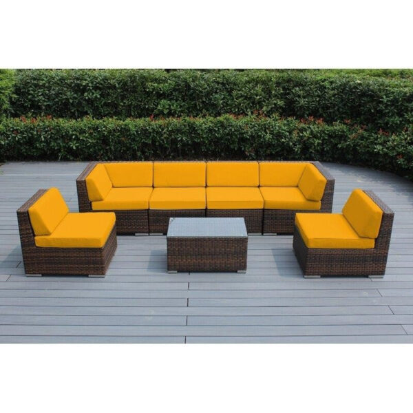 Enjoy a beautiful outdoor seating area with our patio furniture and make every day feel like a vacation. This fabulous set requires no assembly and can be used right out of the box. Solidly constructed with top quality PE resin wicker handwoven around a rust-free powder-coated aluminum frame, it is designed to withstand the elements. The seating comes with easy-to-clean, weather-resistant Sunbrella or Spuncrylic cushions, while the coffee table is topped with glass to protect the wicker from spills and stains. This seating groups modular design allows you to bring the group together for a conversational arrangement or spread out the seating for extra room at your next cookout.