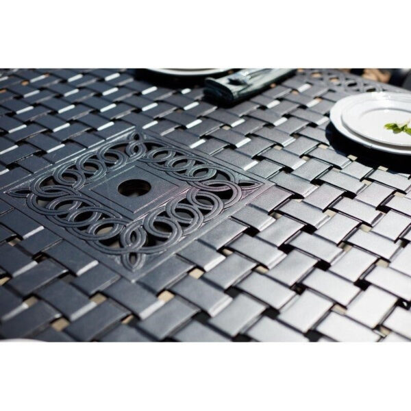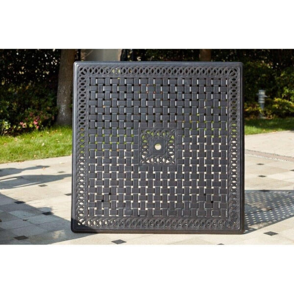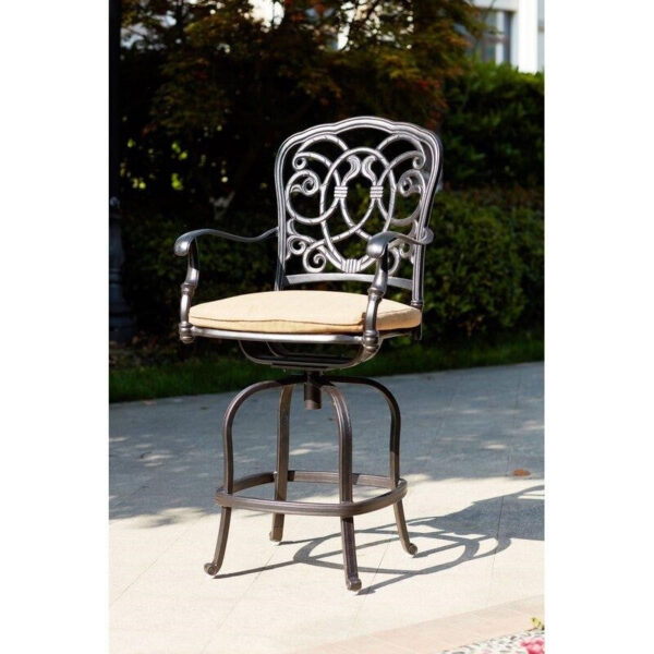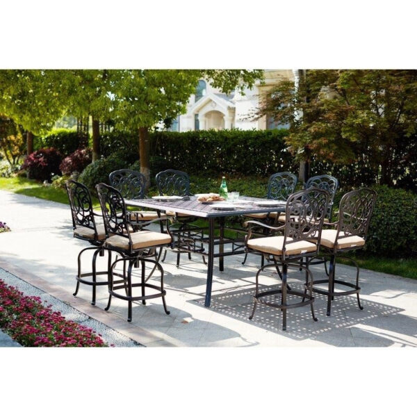 Share a wonderful experience dining outdoors with your family and friends in our nine piece counter height bar dining set. The bar stools have lovely scroll work and come with seat cushions for added comfort. The square table is roomy yet has an intimate quality. This set is cast aluminum with a rich antique bronze finish.