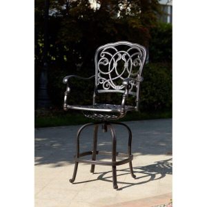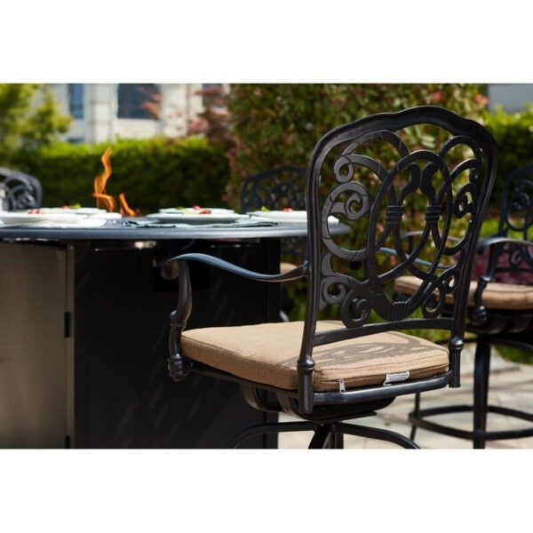 This seven-piece propane firepit counter height bar set can be added to your patio or any outdoor entertainment area. The set is very comfortable for any occasion and would make a great accent piece for any backyard The pieces are cast aluminum and have a rich Antique Bronze finish. This set seats six people and the best part is the warmth and conversation you will have around the propane firepit.