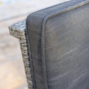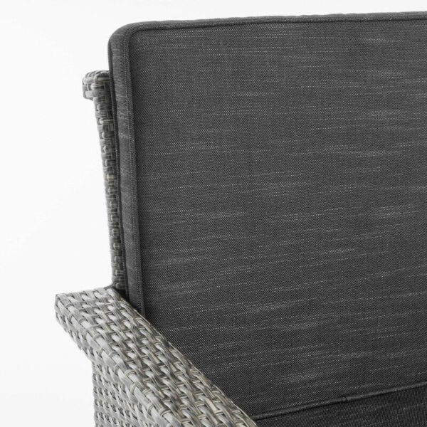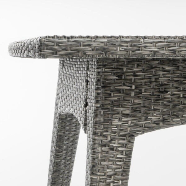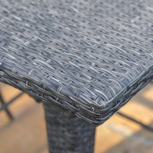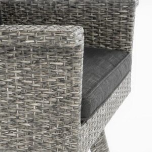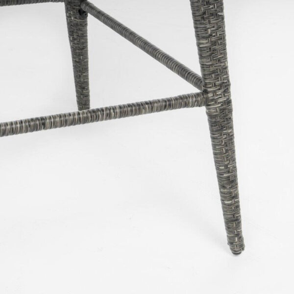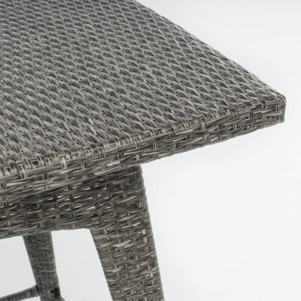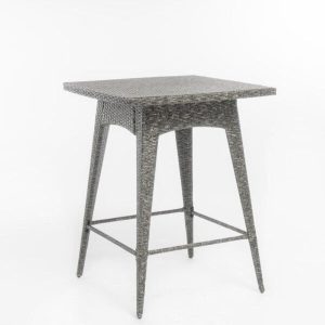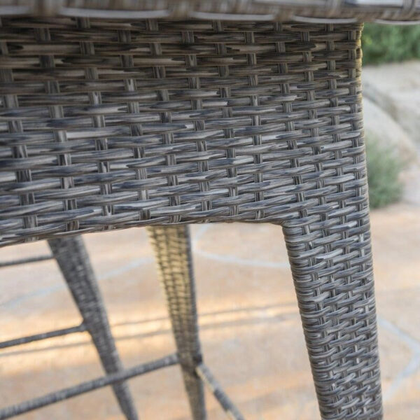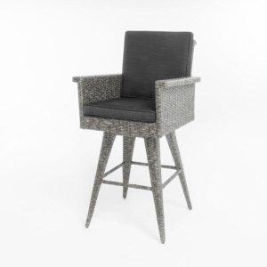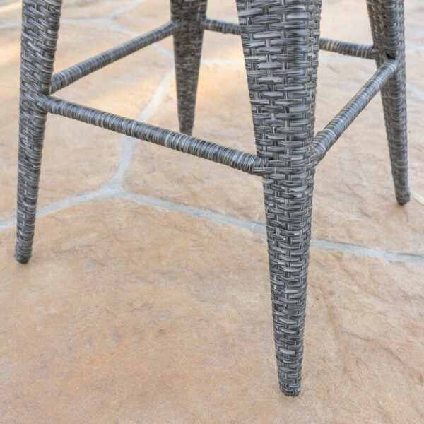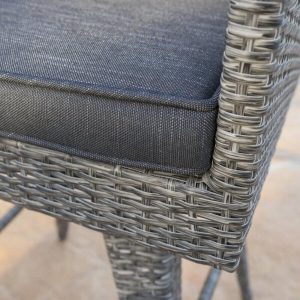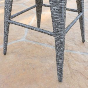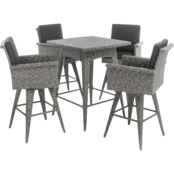 Enjoy family meals under-the-stars or invite guests over for an alfresco cocktail party with this five-piece bar height patio dining set. Crafted from woven wicker rattan, this set is weather, water, and rust resistant. Each seat also features a swivel capability, and built-in footrest, along with detachable dark gray upholstered cushions. To clean this coastal-inspired set, we recommend wiping with a damp cloth and mild soap. Assembly is required upon arrival.