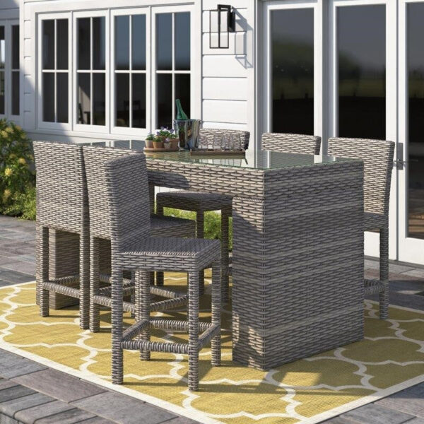 Entertain outdoors with this 7-piece pub table set, giving you plenty of space to spread out a buffet of hot dogs or a few of your favorite drinks. Founded atop an aluminum frame, its table features clean lines and two legs, and is wrapped in hand-woven resin wicker. Its weather-, water-, UV-, and rust-resistant, making it safe to sit outdoors. Plus, its topped off with tempered glass, which is easy to clean and provides a smooth surface for plates and glasses. Six chairs of the same construction are also included.