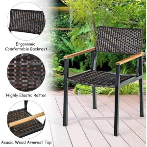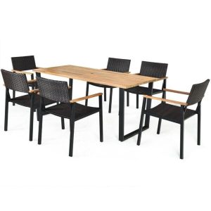 The dining table with a solid metal frame and acacia wood tabletop is sturdy and durable enough to use for a long time. The unique base design ensures good weight capacity. In order to increase stability, the table also has adjustable non-slip feet for use on uneven ground. This dining set also includes 6 comfortable chairs made of rattan, which is enough for you and your family. Moreover, the lightweight chair allows you to use it elsewhere effortlessly. The classic tabletop has an umbrella hole with a diameter of 2.16o facilitate the installation of an umbrella. It can be a great addition in your backyard, garden, balcony, and other outdoor space.