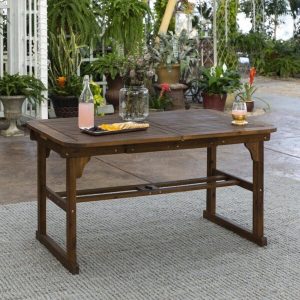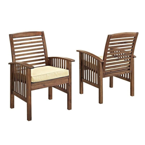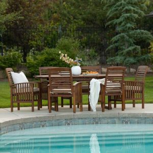 Affordable acacia wood is an ideal outdoor furniture material for many reasons! One is that its a sustainable choice, another is that it is strong with high oil content, plus its naturally resistant to everything from rain and rotting to insects. Take this seven-piece dining set for example: made from that must-have material, it is versatile enough for any alfresco ensemble, pairing slatted frames with a neutral brown finish.