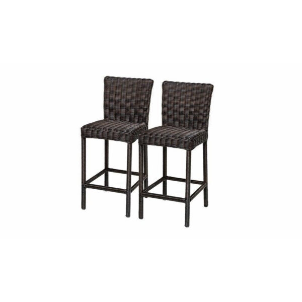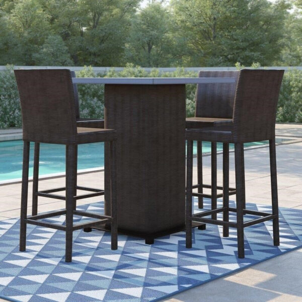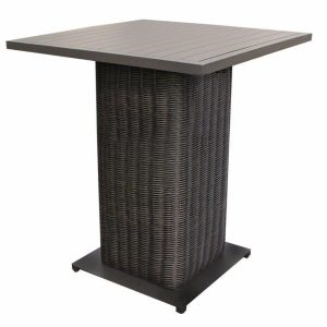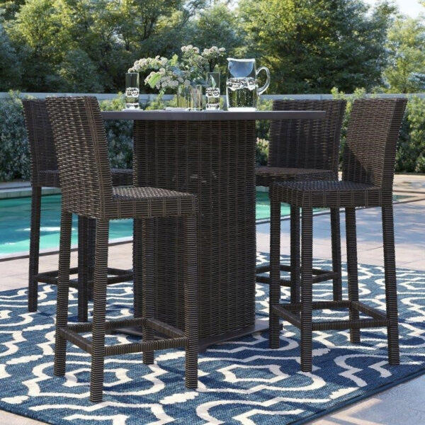 With this 5-piece bar-height dining set, you and your family can enjoy alfresco meals everyday C and make special occasions extra special. It includes a square dining table and four bar stools with high backs. Each piece is crafted with an aluminum frame and wrapped in dark brown, all-weather resin wicker for a coastal look. The pub table features a square pedestal base and a slatted, powder-coated aluminum tabletop that resists rust. All this patio dining furniture holds up to wet weather and stays looking just like new, so you can keep on loving it. And when dinners done, you can simply hose it all down.