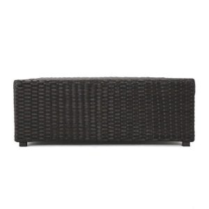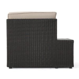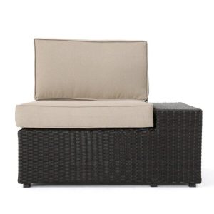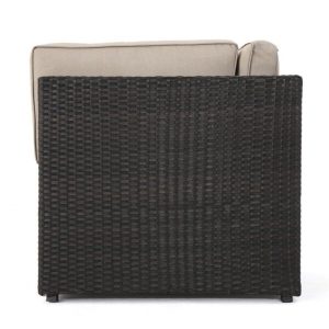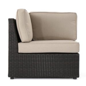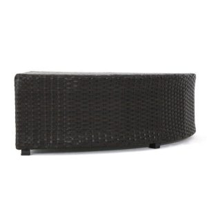 Update your outdoor space with this seven-piece patio conversation set. It includes one coffee table, one corner chair, four armless chairs, one right armchair, and one left armchair. This set is fire resistant and water-resistant, so you can feel comfortable leaving it uncovered on your patio. The frame of the chairs, and table, are all crafted from iron, wrapped in wicker, in a black finish. This set arrives ready to use, with no assembly needed.