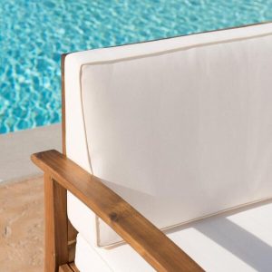 Enhance the functionality of your outdoor sitting area with a new way to enjoy the sunshine and fresh air with loved ones. This assemblage of two stylish club chairs, in combination with two matching sofas, and coffee table is a superb way to populate your patio with pieces that are both attractive and functional. Crafted from solid acacia wood, with sumptuous cushioning, this set is the perfect place to let the drinks flow and the hours roll by. The cushions are crafted from a foam filling.
