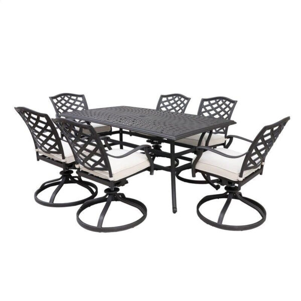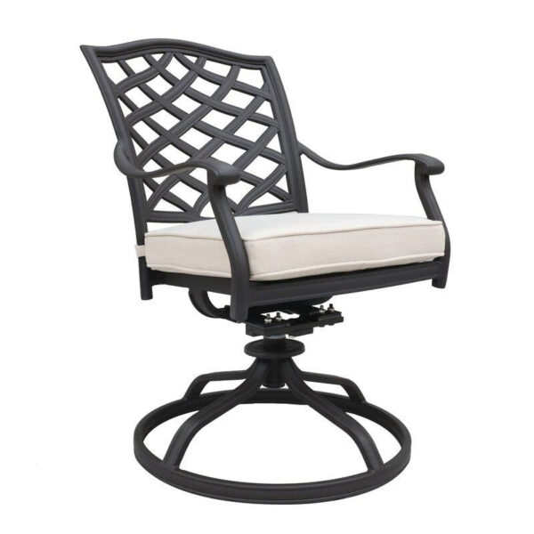 Discover open-air serenity with this set. The highly detailed double lattice design offers casual elegance to any outdoor decor. Features a tough, powder-coated finish that is weather resistant. Extra plush fabric cushions remain colorfast and easy to clean even after seasons in the sun.