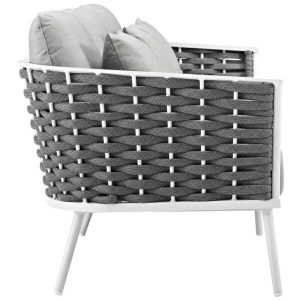 Gather family and friends for pleasant weather and good conversation with the stance outdoor. Boasting a contemporary modern look, stance featured woven polyester fabric rope seat back and flared powder-coated aluminum frame, slatted synthetic wood tabletops, and waterproof all-weather fabric cushions with plush, dense foam padding provide a relaxing spot to the lounge a versatile set designed for long-lasting durability, each piece in the stance.