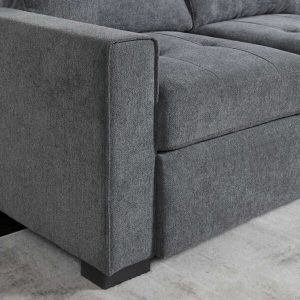 The Kendale Fabric Sofa Chaise was designed with today??s consumer in mind, offering comfort and function in addition to style. The high-density foam cushions offer a comfortable seat, while drop-in pocket coils and sinuous springs prevent sagging. Easily accommodate guests with a pull-out bed and storage compartment for blankets and pillows. The storage and bed pulls can be easily tucked under the cushions when not in use. Kendale is upholstered in ATHENAperformance fabric, that is stain-resistant, water repellent and easy to clean. While durable, the gray fabric is also soft to touch. Sleek track arms and solid wood block feet give Kendale a contemporary feel, while flange welt trim, button less tufting, and box edge cushions offer a tailored look.