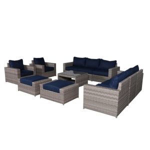 Thick strands of woven resin wicker in a classic gray finish make this 11-piece sectional set last through changing weather C and changing trends. This modular seating set includes two sectional sofas, two deep seating armchairs, and two ottomans, all topped with 5 thick, olefin-upholstered cushions. It comes with furniture clips to keep your outdoor furniture in place and looking just the way you like. Plus, the glass-topped coffee table has a storage cubby for things like plates and cups, so you can be ready to entertain at a moments notice. And theres no assembly required.