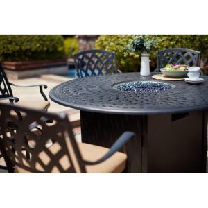 This seven piece propane firepit counter height bar set can be added to your patio or any outdoor entertainment area. The set is very comfortable for any occasion and would make a great accent piece for any backyard The pieces are cast aluminum and have a rich Antique Bronze finish. This set seats six people and the best part is the warmth and conversation you will have around the propane firepit.