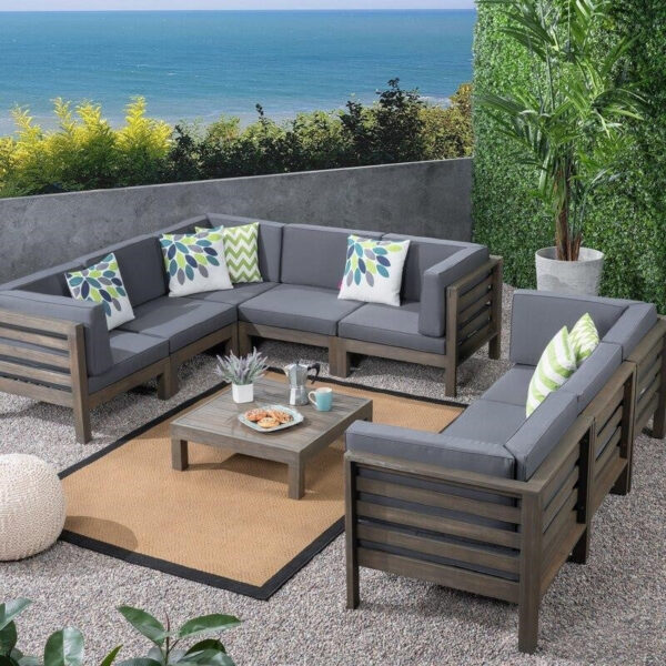 For the host or hostess looking to make a statement at every backyard get-together, this Outdoor 9 Piece Sectional Seating Group with Cushions is an indispensable element of any outdoor furniture set-up. This fully modular assemblage seats seven and is truly extravagant featuring solid acacia wood frames, plush outdoor cushions, and a stylishly-slatted coffee table included, you and your guests will never again be in want of a place to rest while making memories at home. A contemporary take on an iconically retro concept, this collections deep seating and low profile are elegant, luxe, and vibrant enough to bring any porch, patio, or poolside deck to life.