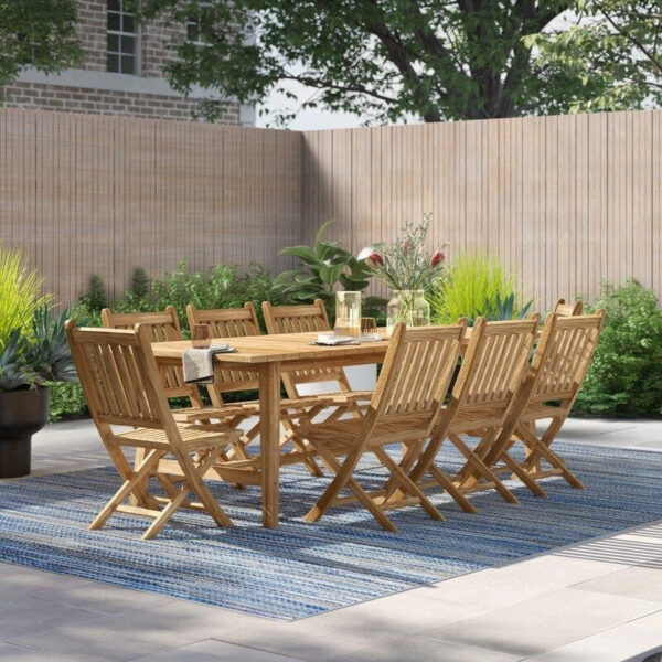 Whether youre hosting a summery dinner party or just want to make the most of a stretch of good weather, adding an outdoor dining set to your patio or deck is a great way to settle in for an alfresco meal. This nine-piece set, for example, includes a table with a plank look and eight armless chairs, all crafted from solid teak wood for a naturally weather- and decay-resistant touch ready for the outdoors (although we still recommend treating it regularly). And since each chair features a folding design, they can be easily stowed when not in use.