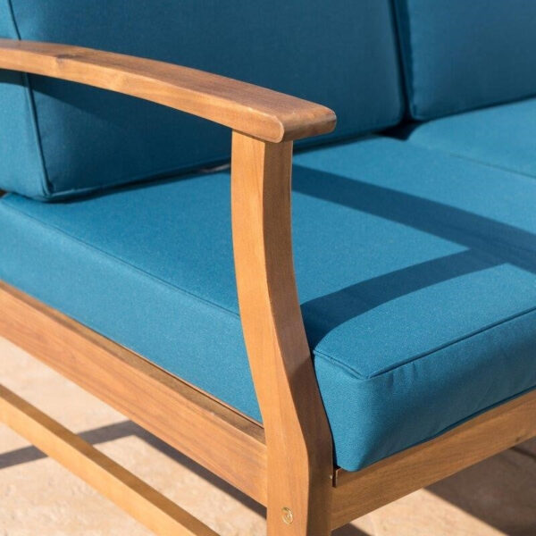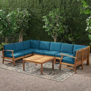 Coordinating a welcoming spot to spend time with guests can be a headache, but with this sectional and coffee table set for your patio, it doesnt have to be. Recline luxuriously into the plush pillows on a warm summer day, its the perfect combination of form, function, and comfort. Why mess with perfectionThis set is constructed from solid acacia wood and includes one left armchair, one right armchair, two corner chairs, four armless chairs, and one coffee table. The cushions are crafted from a polyester blend upholstery, with a foam filling. To clean, we recommend wiping with a cloth and mild soap when needed.