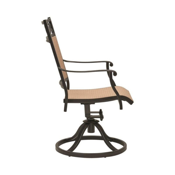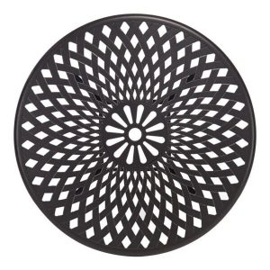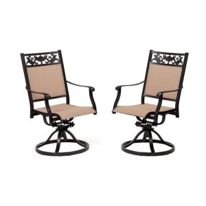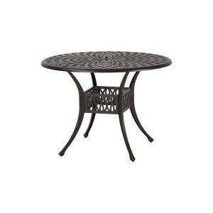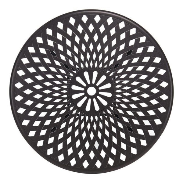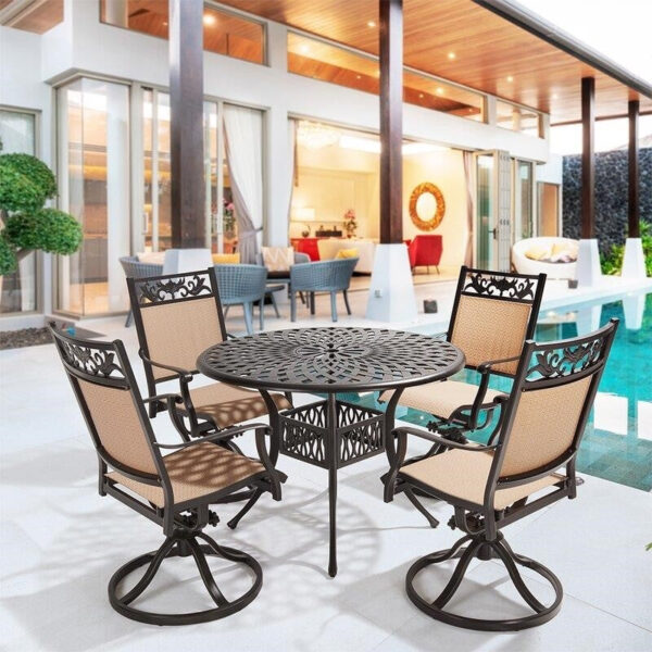 Add motion to your outdoor living space with the round dark brown cast aluminum patio dining set. It is made from premium cast aluminum with a dark brown powder-coat finish thats designed to be rust-resistant and weather resistant. This set is durable heavy-duty cast aluminum dining chairs with arms and a round dining table. The decorative outdoor dining table comes with an umbrella hole in the center of the table as well as anti-slip rubber tips on each table leg. A matching table skirt around the bottom gives more stability and design. Each dining chair also comes with anti-slip rubber tips on base too.