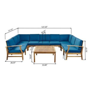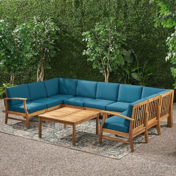 Coordinating a welcoming spot to spend time with guests can be a headache, but with this sectional and coffee table set for your patio, it doesnt have to be. Recline luxuriously into the plush pillows on a warm summer day; its the perfect combination of form, function, and comfort. Why mess with perfectionThis set is constructed from solid acacia wood, and includes one left arm chair, one right arm chair, two corner chairs, five armless chairs, and one coffee table. The cushions are crafted from a polyester blend upholstery, with a foam filling. To clean, we recommend wiping with a cloth and mild soap when needed.